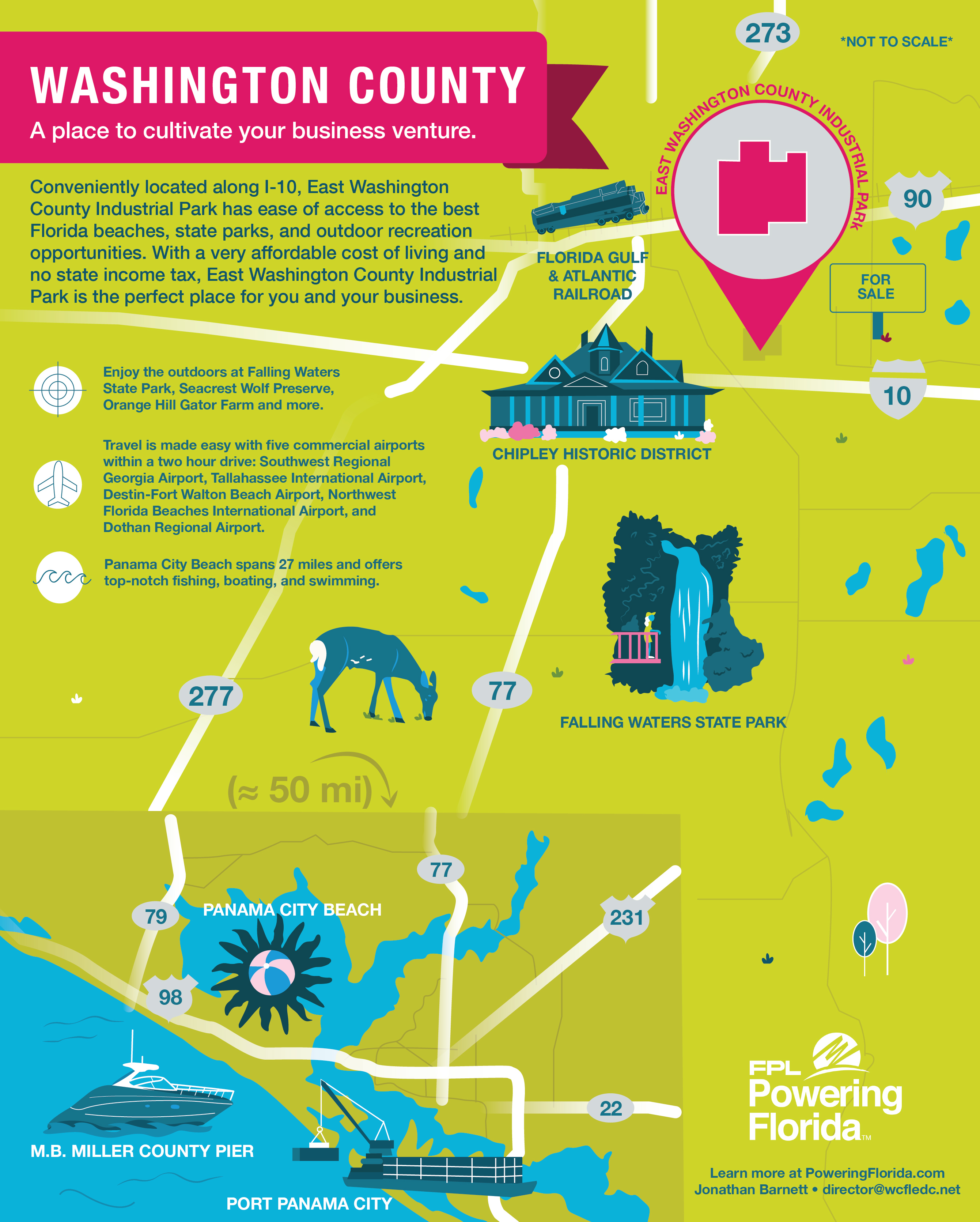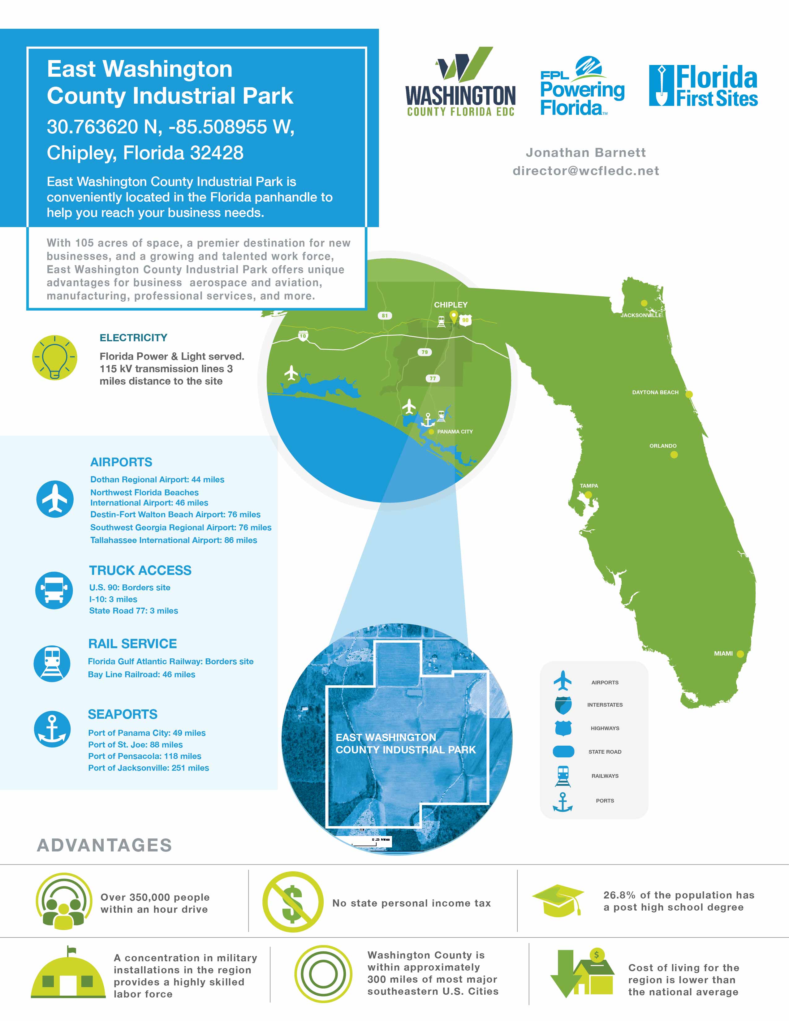 Road access is provided by State Road 77 to I-10, which is just over three miles away from this site. CSX Rail Line, a Class I railroad, is 20 miles from the site and Florida Gulf & Atlantic Railroad transload access is three miles from the site. The Port of Panama City and Northwest Florida Beaches International Airport are less than 50 miles away.